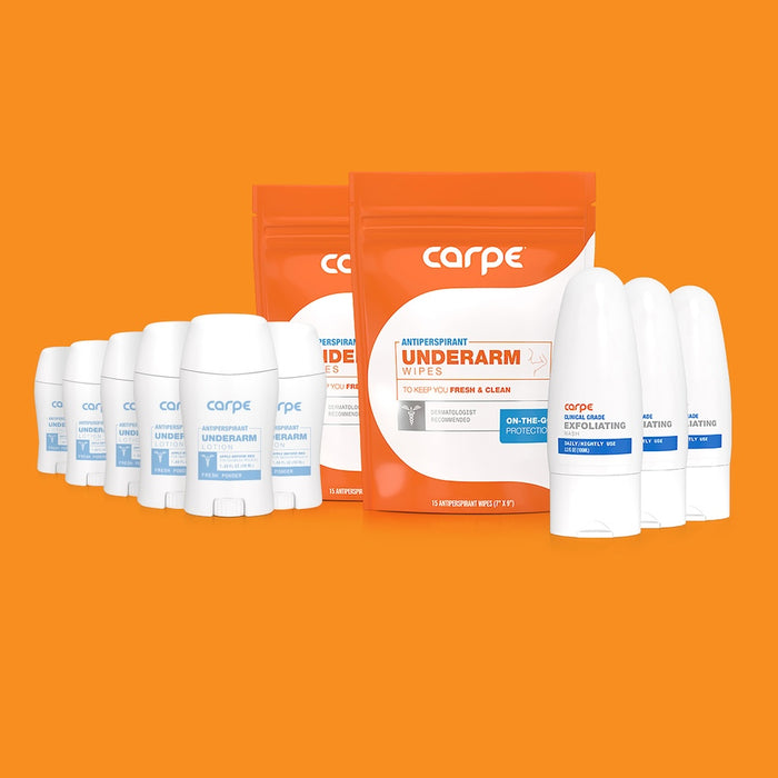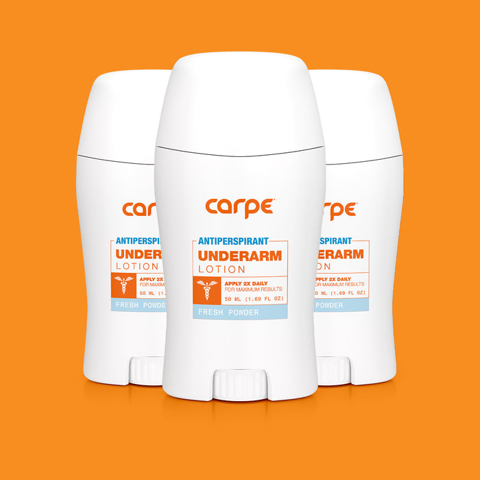 Once your underarms are clean and dry, you are prepped and ready for the benefits of Carpe's revolutionary underarm antiperspirant. As with all extra-strength antiperspirants, Carpe Underarm works best when applied before bed, and again in the morning. Our experience has found that best results are reached after four weeks of consistent use.